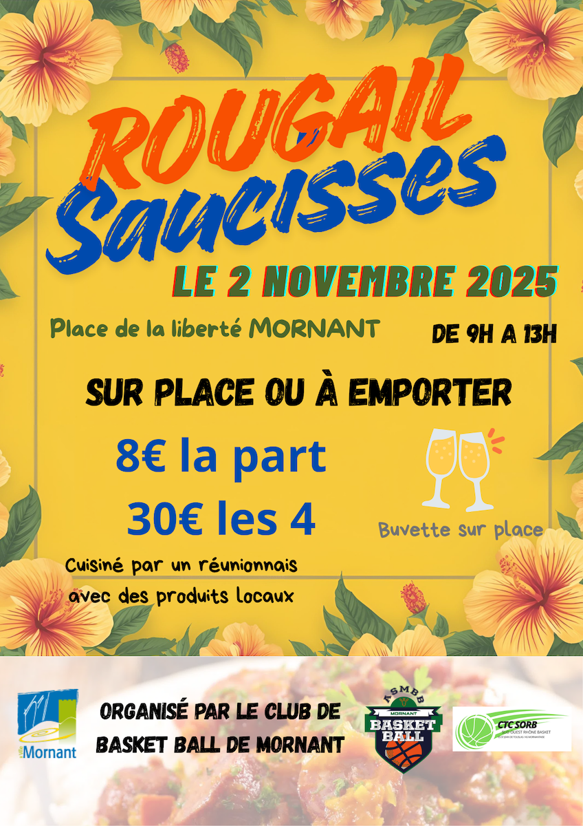 Le club de Basket Ball de Mornant est heureux de vous inviter à leur évènement annuel le Dimanche 2 novembre 2025 de 9h à 13h sur la place de la liberté a Mornant pour un Rougail Saucisses réunionnais !